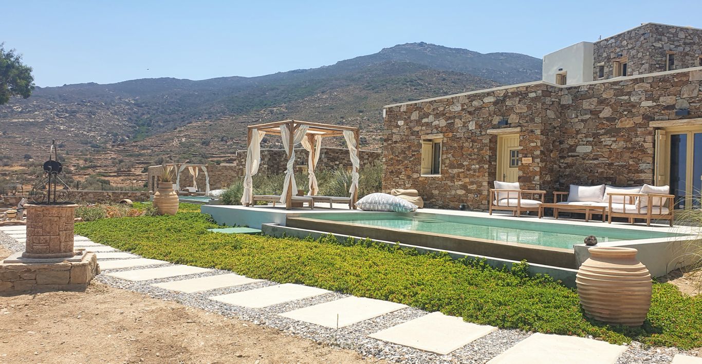 It is decorated with modern materials following the Cycladic architecture with stone and wood being the dominant elements. It consists of a bedroom with a king-size bed and a living room with 2 built-in sofa beds. It has a fully equipped kitchen, dining room, and bathroom. In the outdoor area of the pool, there are sunbeds with an umbrella, pool cushions, and a seating area with a sea view.